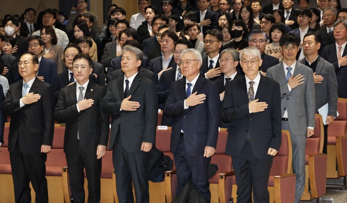[서울=뉴스핌] 양윤모 기자 = 천대엽 법원행정처장이 9일 서울 서초구 서울법원종합청사 청심홀에서 열린 '국민을 위한 사법제도 개편' 공청회에 참석해 국민의례를 하고 있다.