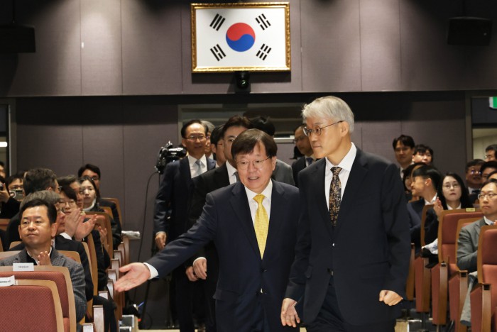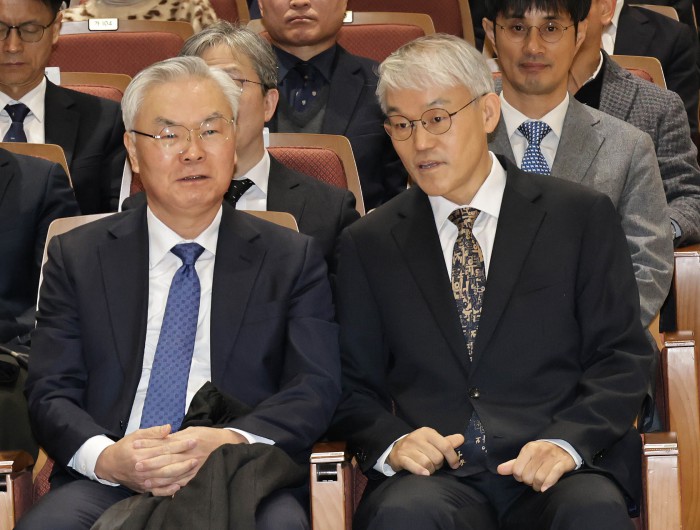[서울=뉴스핌] 양윤모 기자 = 천대엽 법원행정처장이 9일 서울 서초구 서울법원종합청사 청심홀에서 열린 '국민을 위한 사법제도 개편' 공청회에 참석해 김선수 전 대법관 과 대화하고 있다.
