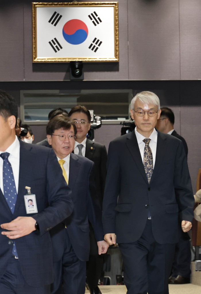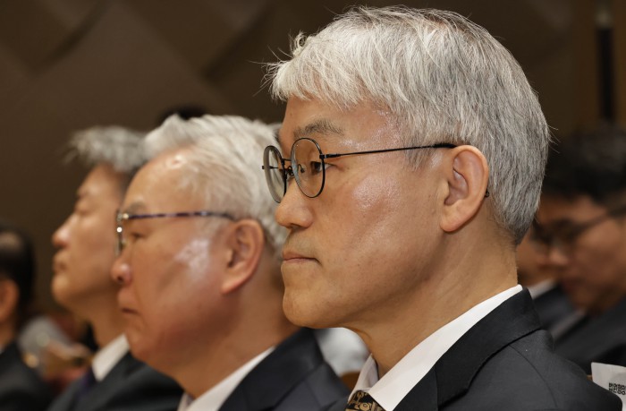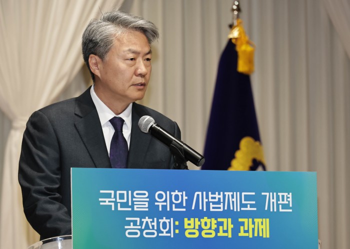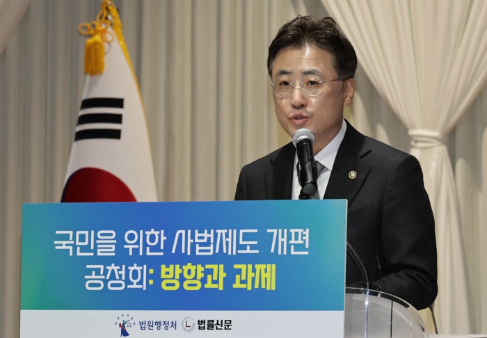 [서울=뉴스핌] 양윤모 기자 = 천대엽 법원행정처장이 9일 서울 서초구 서울법원종합청사 청심홀에서 열린 '국민을 위한 사법제도 개편' 공청회에 참석해 이진수 법무부차관 축사를 경청하고 있다.