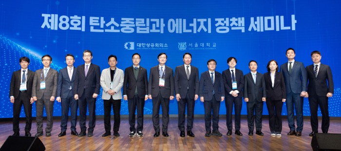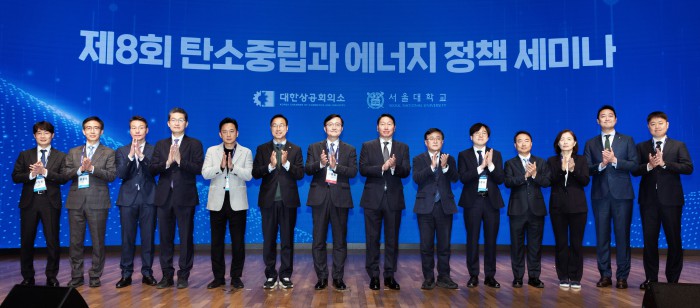 [서울=뉴스핌] 김성환 기후에너지환경부 장관이 10일 서울 중구 대한상공회의소에서 열린 제8회 탄소중립과 에너지 정책 세미나에서 최태원 대한상의 회장, 위성곤 국회 기후위기특별위원회 위원장, 유홍림 서울대학교 총장 등 참석자들과 기념촬영을 하고 있다. [사진=기후에너지환경부] 2025.12.10 photo@newspim.com