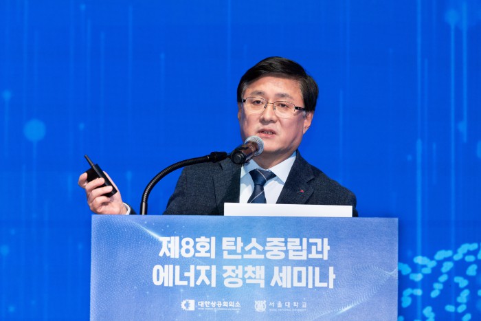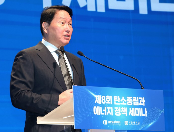 [서울=뉴스핌] 최태원 대한상공회의소 회장이 10일 서울 중구 대한상의에서 열린 제8회 탄소중립과 에너지 정책 세미나에서 개회사를 하고 있다. [사진=대한상공회의소] 2025.12.10 photo@newspim.com