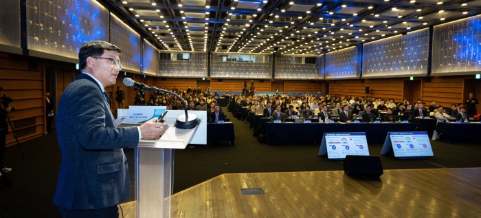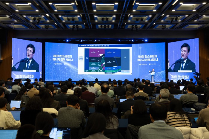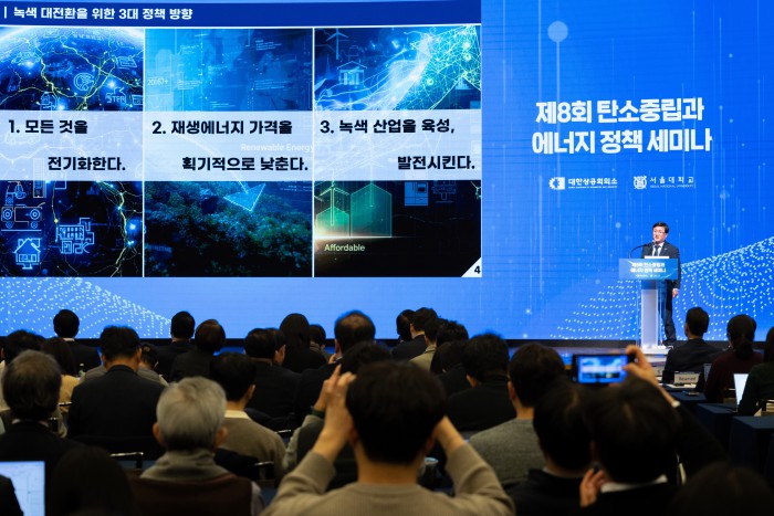 [서울=뉴스핌] 김성환 기후에너지환경부 장관이 10일 서울 중구 대한상공회의소에서 열린 제8회 탄소중립과 에너지 정책 세미나에서 '정부의 탄소중립과 에너지 정책방향 및 이행전략'을 주제로 기조강연을 하고 있다. [사진=기후에너지환경부] 2025.12.10 photo@newspim.com