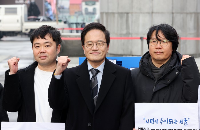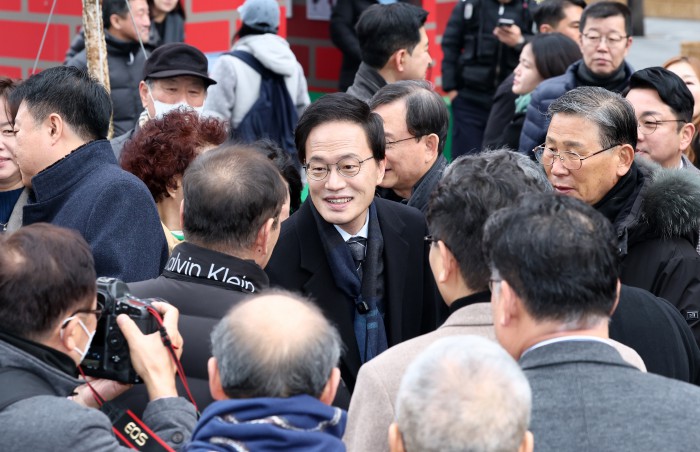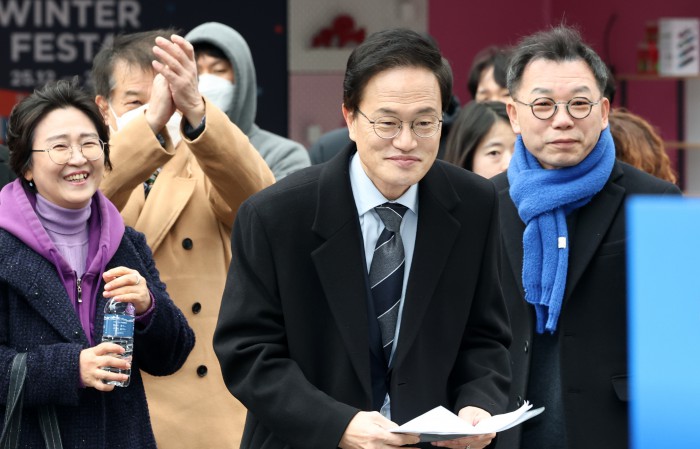 [서울=뉴스핌] 최지환 기자 = 박주민 더불어민주당 의원이 11일 오전 서울 종로구 광화문광장에서 서울시장 출마선언을 앞두고 지지자들과 인사하고 있다. 2025.12.11 choipix16@newspim.com