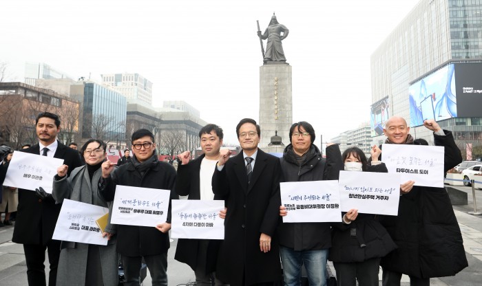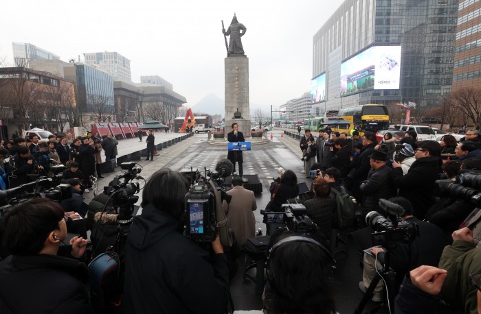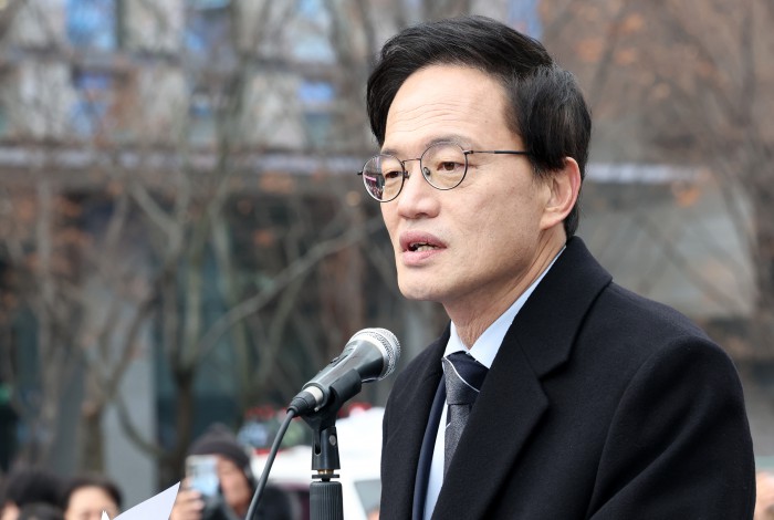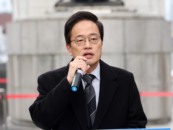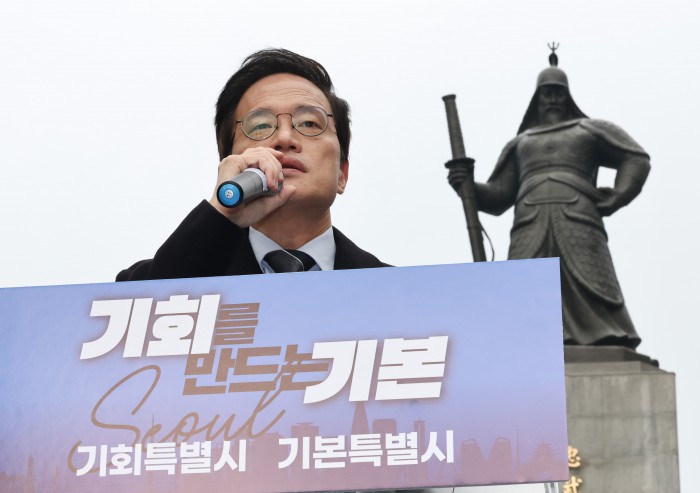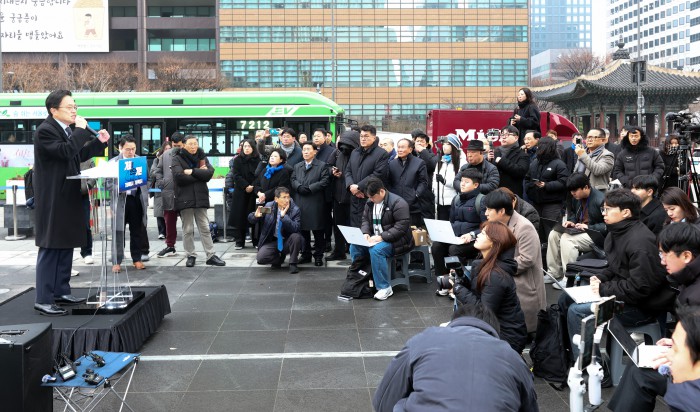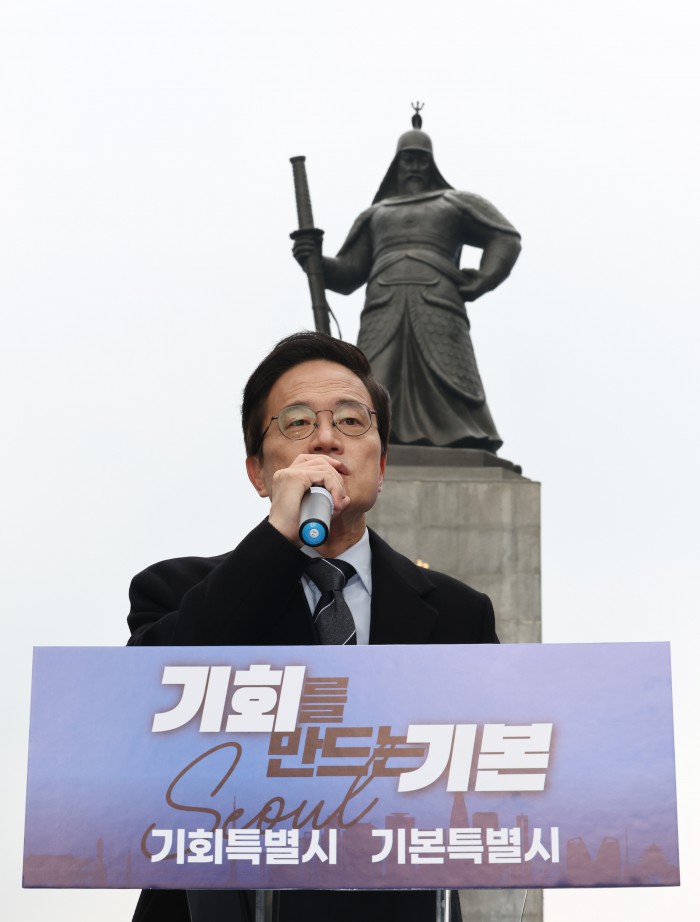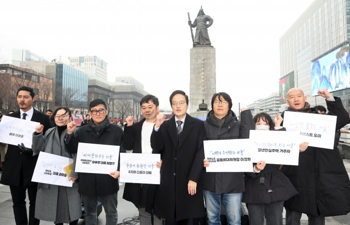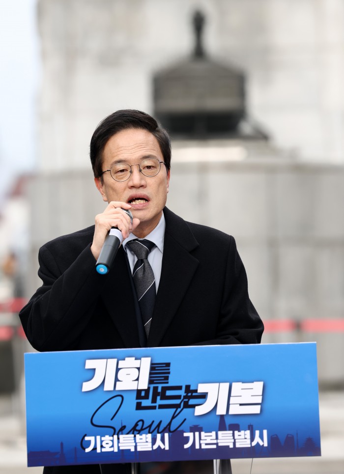 [서울=뉴스핌] 최지환 기자 = 박주민 더불어민주당 의원이 11일 오전 서울 종로구 광화문광장에서 서울시장 출마선언을 하고 있다. 2025.12.11 choipix16@newspim.com