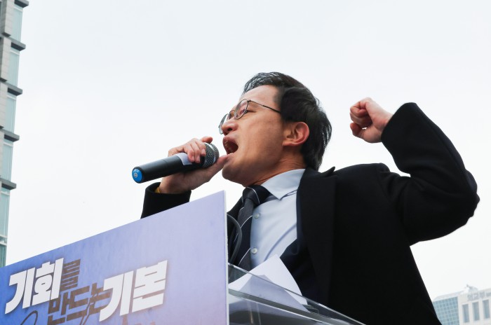 [서울=뉴스핌] 최지환 기자 = 박주민 더불어민주당 의원이 11일 오전 서울 종로구 광화문광장에서 서울시장 출마선언을 위해 단상으로 향하고 있다. 2025.12.11 choipix16@newspim.com