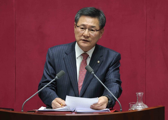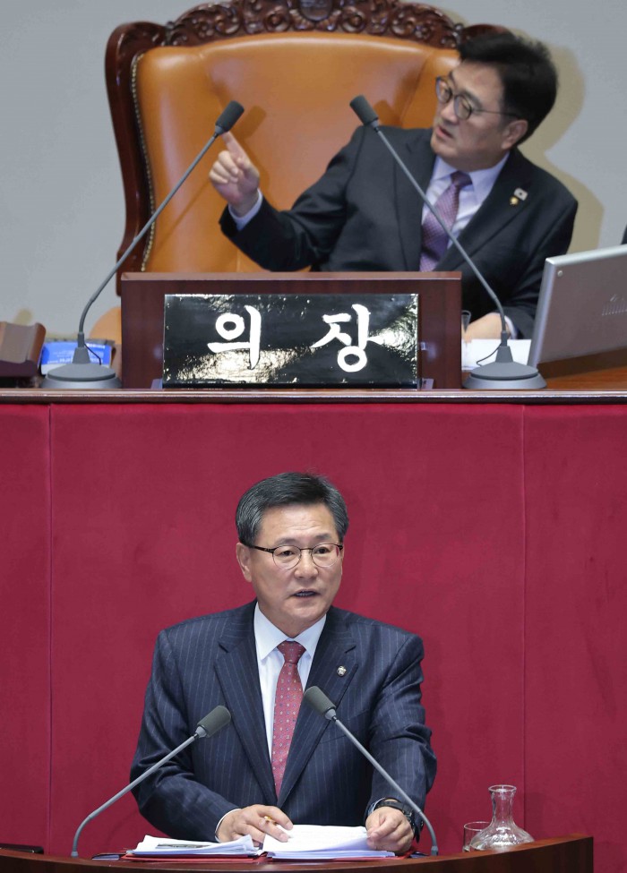 [서울=뉴스핌] 윤창빈 기자 = 이헌승 국민의힘 의원이 12일 서울 여의도 국회에서 열린 본회의에서 은행법 일부개정법률안에 대한 무제한 토론을 하고 있다 . 2025.12.12 pangbin@newspim.com