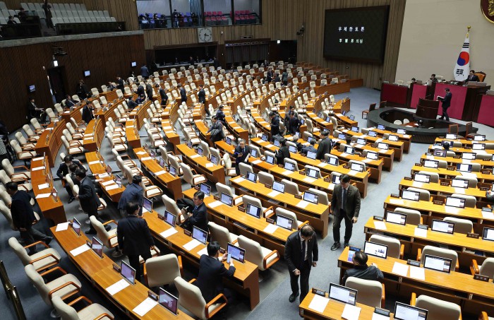 [서울=뉴스핌] 윤창빈 기자 = 12일 서울 여의도 국회에서 열린 본회의에서 이헌승 국민의힘 의원이 은행법 일부개정법률안에 대한 무제한 토론을 시작하자 더불어민주당 의원들이 회의장을 나서고 있다. 2025.12.12 pangbin@newspim.com
