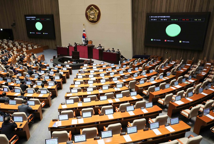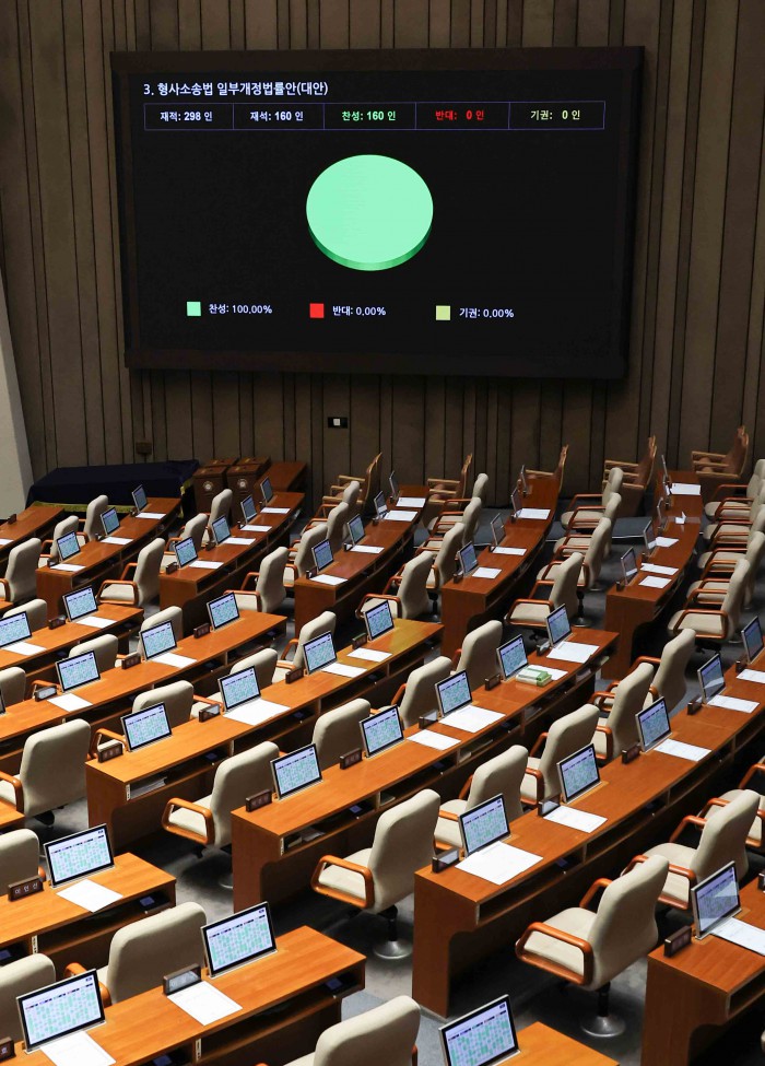 [서울=뉴스핌] 윤창빈 기자 = 12일 서울 여의도 국회에서 열린 본회의에서 형사소송법 일부개정법률안(대안)이 가결되고 있다. 2025.12.12 pangbin@newspim.com