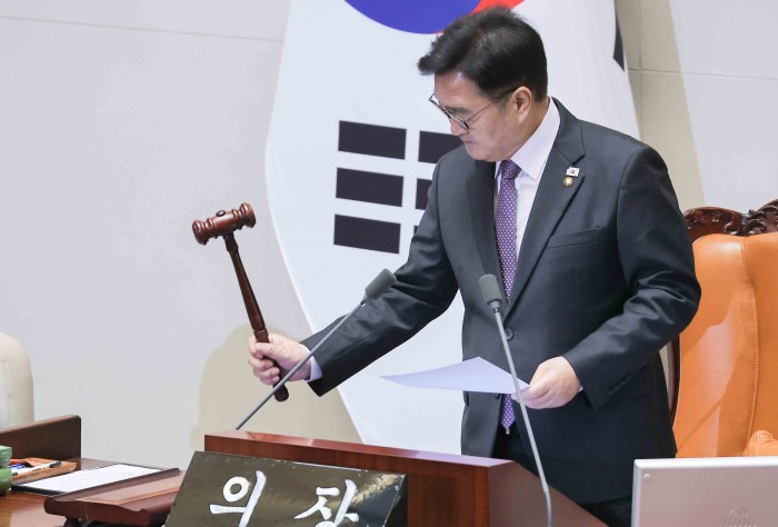 [서울=뉴스핌] 윤창빈 기자 = 우원식 국회의장이 12일 서울 여의도 국회에서 열린 본회의에서 의사봉을 두드리고 있다. 2025.12.12 pangbin@newspim.com