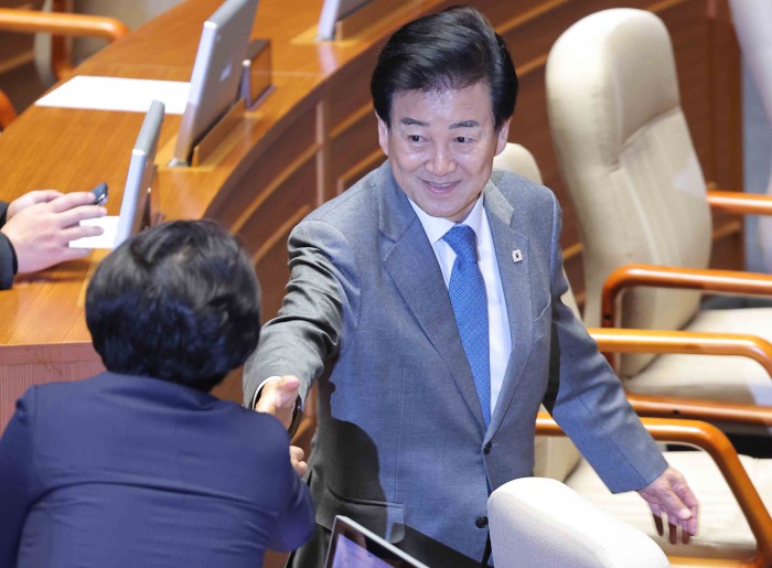 [서울=뉴스핌] 윤창빈 기자 = 정동영 통일부 장관이 12일 서울 여의도 국회에서 열린 본회의에서 더불어민주당 의원들과 인사를 나누고 있다. 2025.12.12 pangbin@newspim.com
