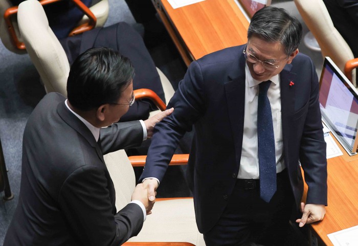 [서울=뉴스핌] 윤창빈 기자 = 정성호 법무부 장관, 유상범 국민의힘 의원이 12일 서울 여의도 국회에서 열린 본회의에서 인사를 나누고 있다. 2025.12.12 pangbin@newspim.com