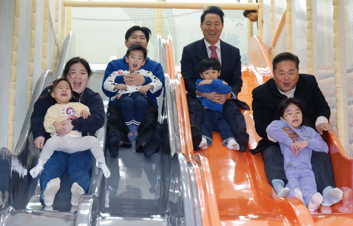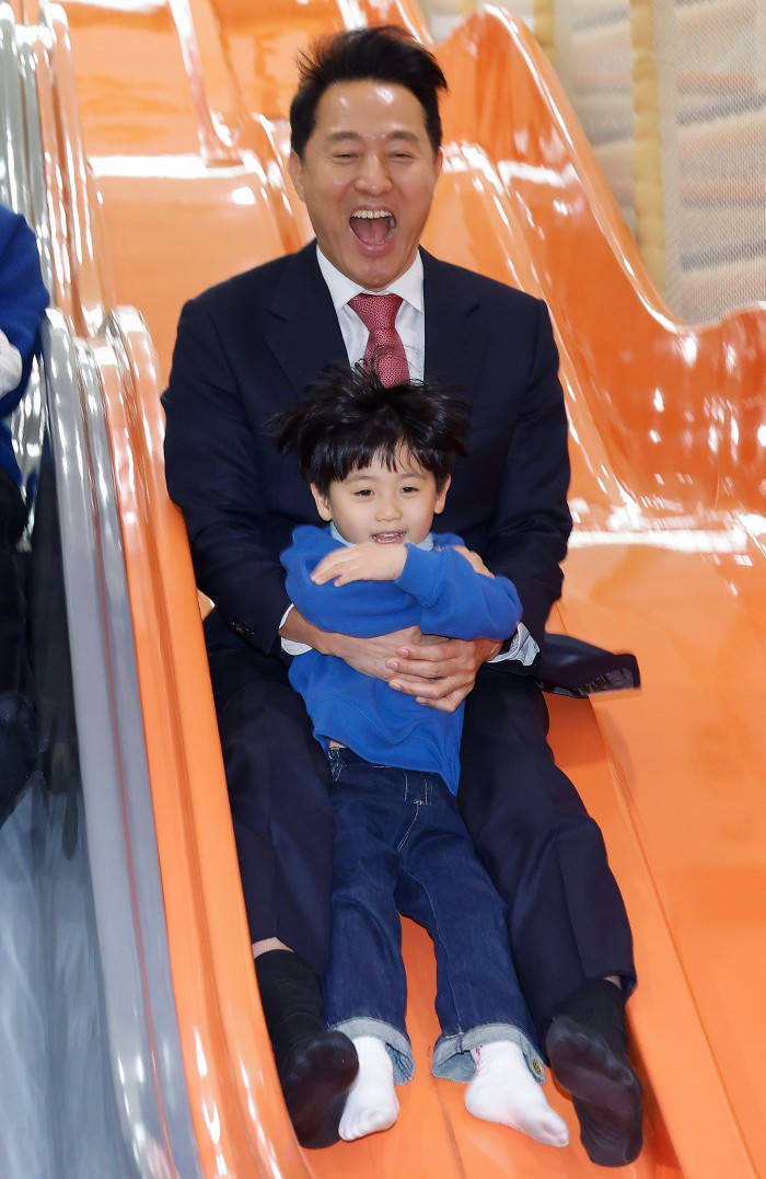 [서울=뉴스핌] 류기찬 기자 = 오세훈 서울시장이 12일 오후 서울 강서구 서울키즈플라자에서 열린 ‘서울키즈플라자 개관식’에서 어린이들과 함께 미끄럼틀을 타고 있다. 서울 키즈플라자는 놀이, 돌봄, 마음건강 기능을 한 건물 안에 집약시킨 통합 거점 시설로, 지역 내 어린이 시설 등과 유기적으로 연계해 아이들의 건강한 성장을 지원하고 부모의 양육 부담을 덜어주는 공간이다. 2025.12.12 ryuchan0925@newspim.com