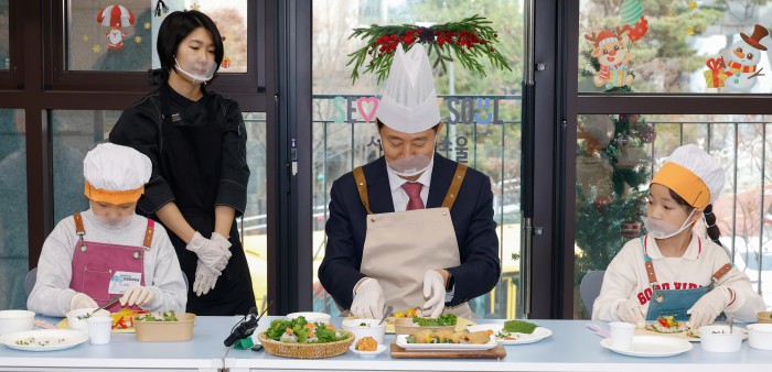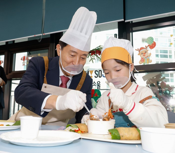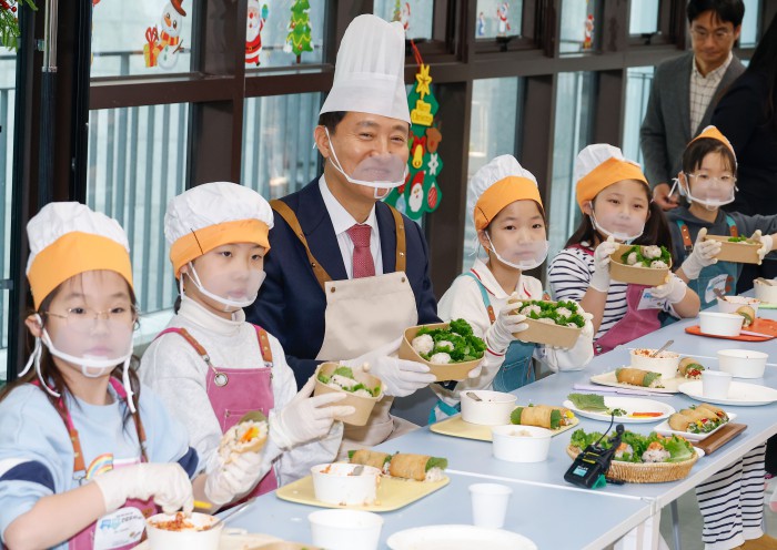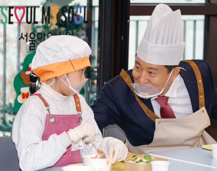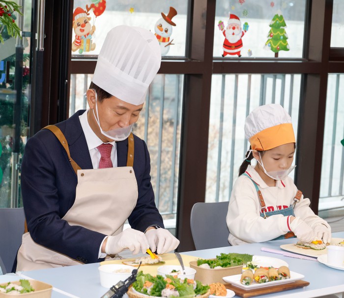 [서울=뉴스핌] 류기찬 기자 = 오세훈 서울시장이 12일 오후 서울 강서구 서울키즈플라자에서 열린 ‘서울키즈플라자 개관식’에서 어린이들과 함께 요리교실 체험을 하고 있다. 서울 키즈플라자는 놀이, 돌봄, 마음건강 기능을 한 건물 안에 집약시킨 통합 거점 시설로, 지역 내 어린이 시설 등과 유기적으로 연계해 아이들의 건강한 성장을 지원하고 부모의 양육 부담을 덜어주는 공간이다. 2025.12.12 ryuchan0925@newspim.com