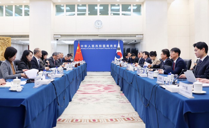 [서울=뉴스핌] 김정관 산업통상부 장관이 12일(현지시간) 중국 베이징 상무부에서 왕 원타오 중국 상무부 부장과 면담을 하고 있다. [사진=산업통상부] 2025.12.12 photo@newspim.com