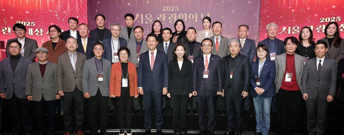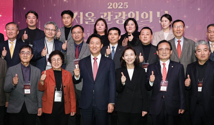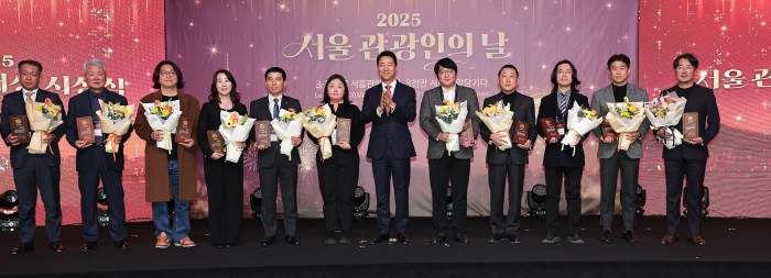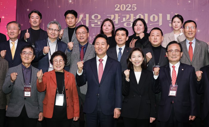 [서울=뉴스핌] 양윤모 기자 = 오세훈 서울시장이 12일 오후 서초구 세빛섬 플로팅 아일랜드에서 개최된 '2025 서울관광인의 날 및 서울관광대상 시상식' 행사에서 참석자들과 기념촬영을 하고 있다. 2025.12.12 yym58@newspim.com