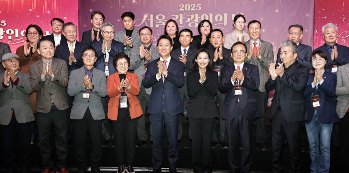 [서울=뉴스핌] 양윤모 기자 = 오세훈 서울시장이 12일 오후 서초구 세빛섬 플로팅 아일랜드에서 개최된 '2025 서울관광인의 날 및 서울관광대상 시상식' 행사에 참석해 서울관광대상 수상자들과 기념촬영을 하고 있다. 2025.12.12 yym58@newspim.com