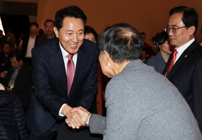 [서울=뉴스핌] 양윤모 기자 = 오세훈 서울시장이 12일 오후 서초구 세빛섬 플로팅 아일랜드에서 개최된 '2025 서울관광인의 날 및 서울관광대상 시상식' 행사에서 참석하며 관계자들과 악수하고 있다. 2025.12.12 yym58@newspim.com