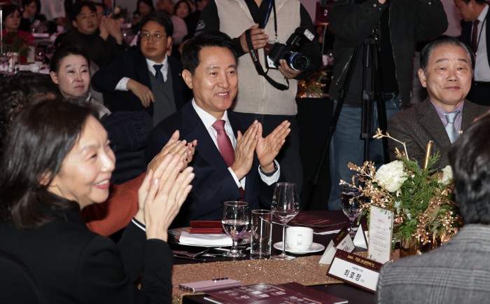 [서울=뉴스핌] 양윤모 기자 = 오세훈 서울시장이 12일 오후 서초구 세빛섬 플로팅 아일랜드에서 개최된 '2025 서울관광인의 날 및 서울관광대상 시상식' 행사에서 참석해 박수를 보내고 있다. 2025.12.12 yym58@newspim.com