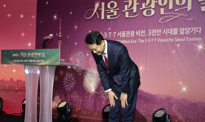 [서울=뉴스핌] 양윤모 기자 = 오세훈 서울시장이 12일 오후 서초구 세빛섬 플로팅 아일랜드에서 개최된 '2025 서울관광인의 날 및 서울관광대상 시상식' 행사에 참석해 인사말을 하기전 고개숙여 인사하고 있다. 2025.12.12 yym58@newspim.com