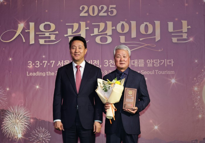 [서울=뉴스핌] 양윤모 기자 = 오세훈 서울시장이 12일 오후 서초구 세빛섬 플로팅 아일랜드에서 개최된 '2025 서울관광인의 날 및 서울관광대상 시상식' 행사에 참석해 석채언 혜초여행개발(주) 대표에게 서울관광인 대상 표창패를 수여후 기념촬영을 하고 있다. 2025.12.12 yym58@newspim.com