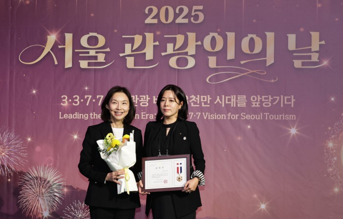 [서울=뉴스핌] 양윤모 기자 = 최호정 서울시의회 의장이 12일 오후 서초구 세빛섬 플로팅 아일랜드에서 개최된 '2025 서울관광인의 날 및 서울관광대상 시상식' 행사에 참석해 박금나 파르나스호텔(주) 객실세일즈팀장에게 서울시의회 의장상을 수여후 기념촬영을 하고 있다. 2025.12.12 yym58@newspim.com