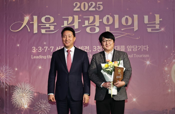 [서울=뉴스핌] 양윤모 기자 = 오세훈 서울시장이 12일 오후 서초구 세빛섬 플로팅 아일랜드에서 개최된 '2025 서울관광인의 날 및 서울관광대상 시상식' 행사에 참석해 강호진 (주)롯데호텔 시그니엘서울 식음팀 업장책임자에게 서울관광서비스 대상 표창패를 수여후 기념촬영을 하고 있다. 2025.12.12 yym58@newspim.com