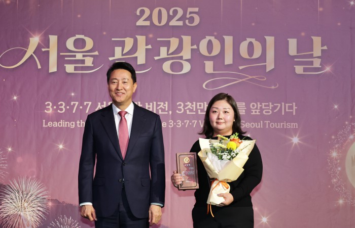 [서울=뉴스핌] 양윤모 기자 = 오세훈 서울시장이 12일 오후 서초구 세빛섬 플로팅 아일랜드에서 개최된 '2025 서울관광인의 날 및 서울관광대상 시상식' 행사에 참석해 이지혜 서울시관광협회 팀장에게 서울관광서비스 대상 표창패를 수여후 기념촬영을 하고 있다. 2025.12.12 yym58@newspim.com