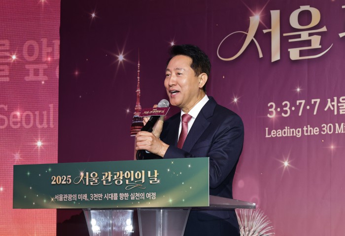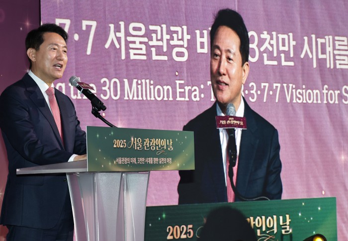 [서울=뉴스핌] 양윤모 기자 = 오세훈 서울시장이 12일 오후 서초구 세빛섬 플로팅 아일랜드에서 개최된 '2025 서울관광인의 날 및 서울관광대상 시상식' 행사에 참석해 인사말을 하고 있다. 2025.12.12 yym58@newspim.com