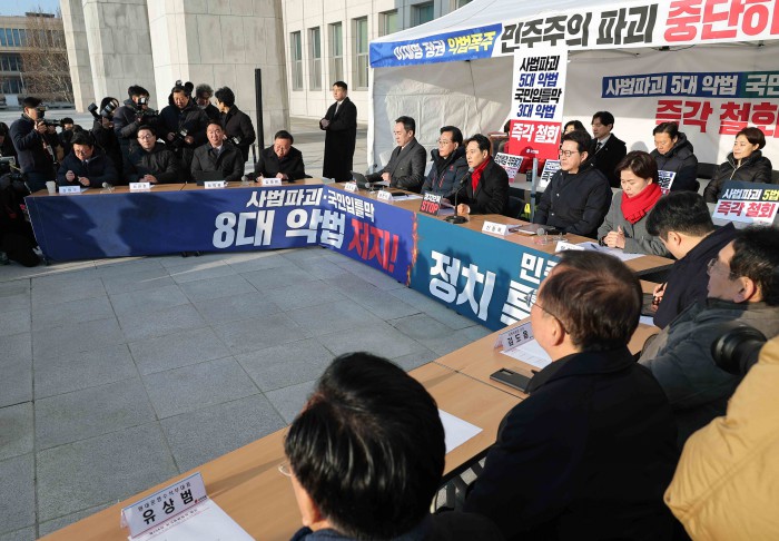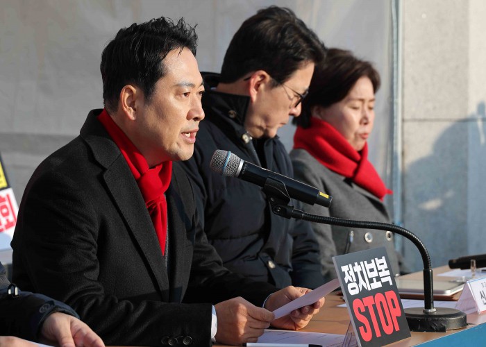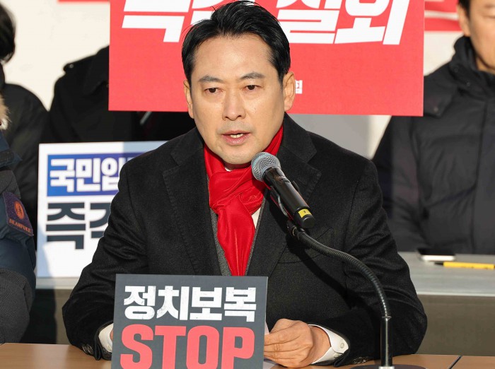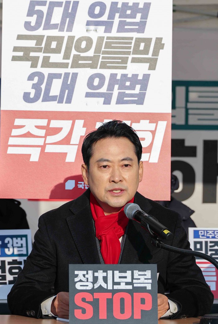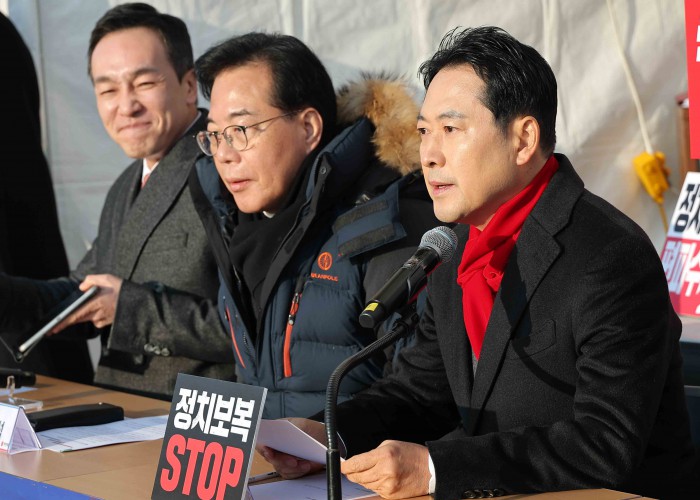 [서울=뉴스핌] 윤창빈 기자 = 장동혁 국민의힘 대표가 15일 서울 여의도 국회 본관 앞 천막에서 열린 최고위원회의에서 모두발언을 하고 있다. 2025.12.15 pangbin@newspim.com