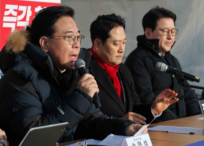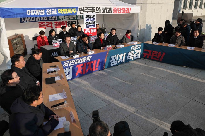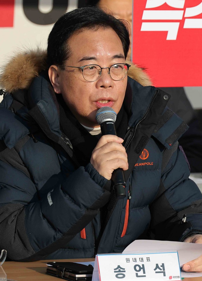[서울=뉴스핌] 윤창빈 기자 = 송언석 국민의힘 원내대표가 15일 서울 여의도 국회 본관 앞 천막에서 열린 최고위원회의에서 모두발언을 하고 있다. 2025.12.15 pangbin@newspim.com