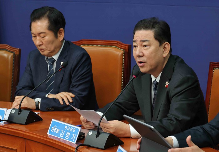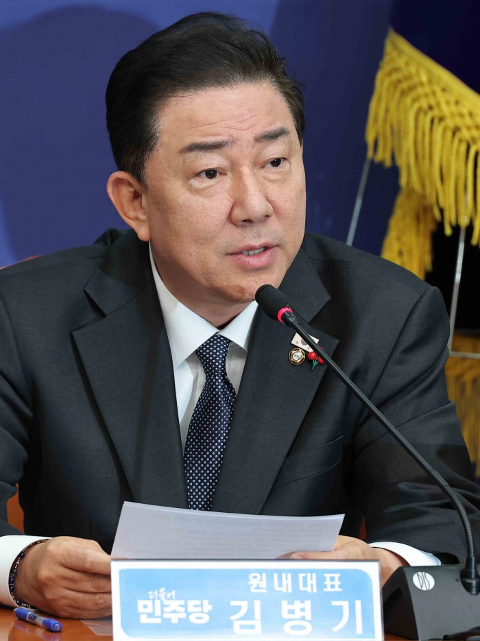 [서울=뉴스핌] 윤창빈 기자 = 김병기 더불어민주당 대표가 15일 서울 여의도 국회에서 열린 최고위원회의에서 모두발언을 하고 있다. 2025.12.15 pangbin@newspim.com