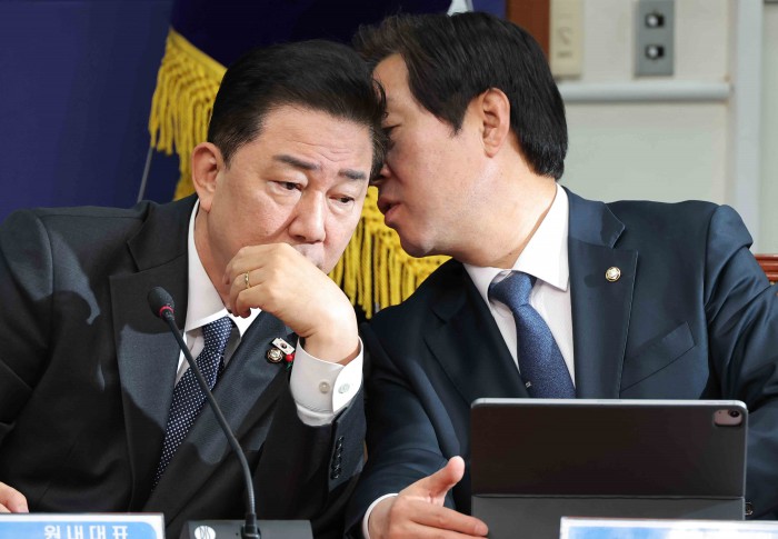 [서울=뉴스핌] 윤창빈 기자 = 김병기 더불어민주당 대표, 황명선 최고위원이 15일 서울 여의도 국회에서 열린 최고위원회의에서 대화를 하고 있다. 2025.12.15 pangbin@newspim.com