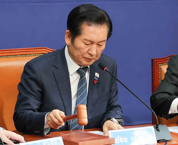 [서울=뉴스핌] 윤창빈 기자 = 정청래 더불어민주당 대표가 15일 서울 여의도 국회에서 열린 최고위원회의에서 의사봉을 두드리고 있다. 2025.12.15 pangbin@newspim.com