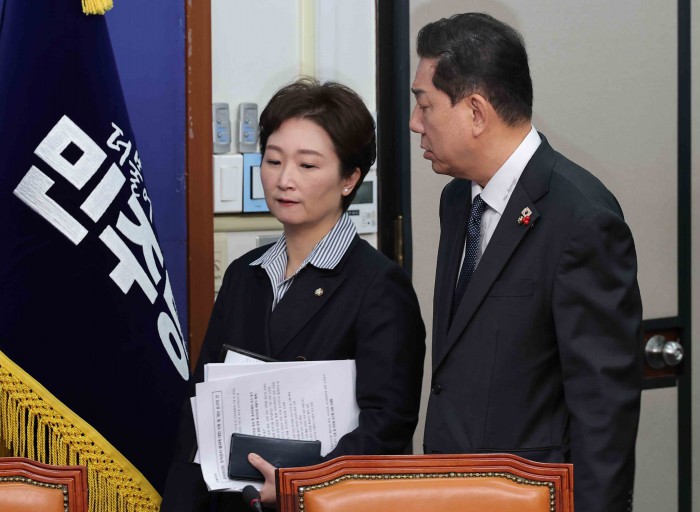 [서울=뉴스핌] 윤창빈 기자 = 김병기 더불어민주당 원내대표, 이언주 최고위원이 15일 서울 여의도 국회에서 열린 최고위원회의에서 대화를 하고 있다. 2025.12.15 pangbin@newspim.com