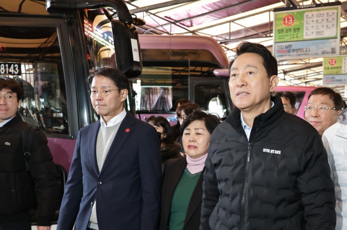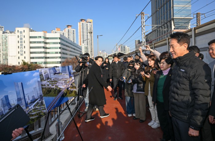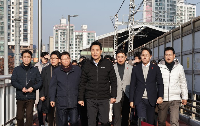 [서울=뉴스핌] 양윤모 기자 = 오세훈 서울시장이 15일 오전 광진구 구의동 동서울터미널을 방문 '동서울터미널 현대화사업' 개발대상지를 임영록 신세계프라퍼티 대표의 안내로 이동하고 있다.