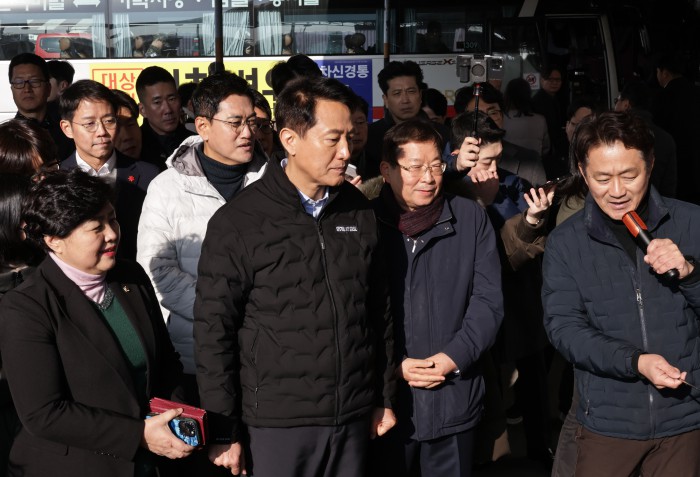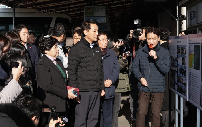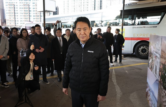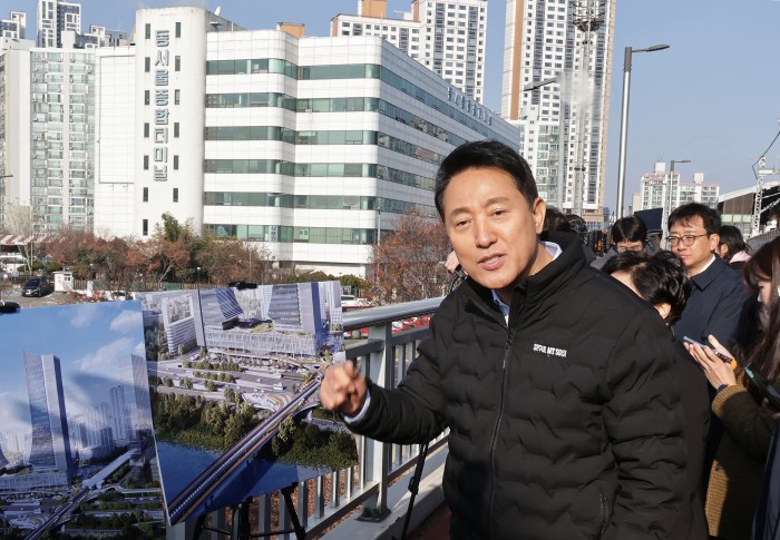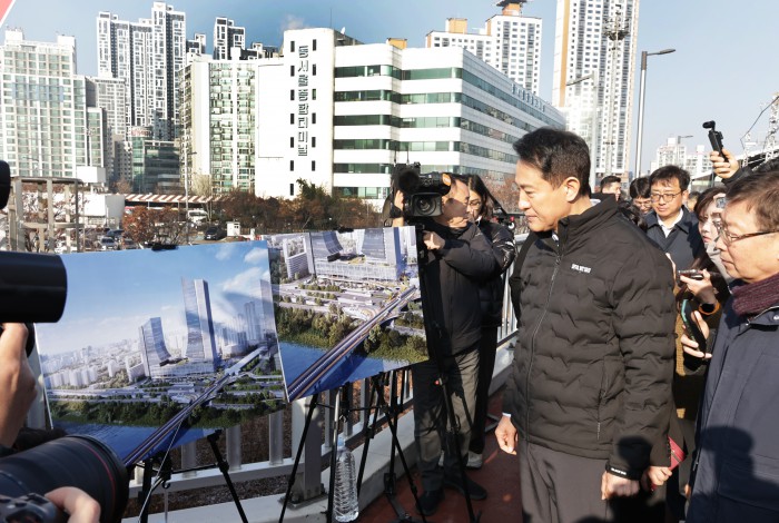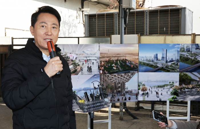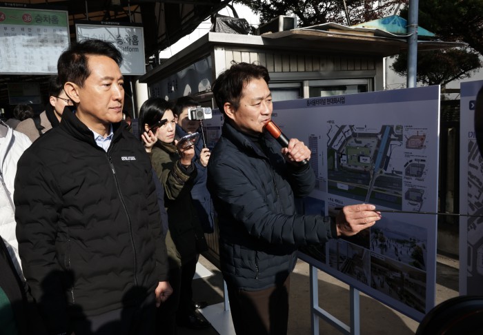[서울=뉴스핌] 양윤모 기자 = 오세훈 서울시장이 15일 오전 광진구 구의동 동서울터미널을 방문 '동서울터미널 현대화사업' 개발대상지를 방문 임영록 신세계프라퍼티 대표등이 참석한 가운데 관계자의 성명을 듣고 있다.