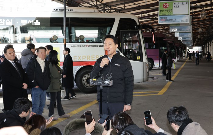 [서울=뉴스핌] 양윤모 기자 = 오세훈 서울시장이 15일 오전 광진구 구의동 동서울터미널을 방문 '동서울터미널 현대화사업' 개발대상지를 방문 취재진의 질문에 답하고 있다.