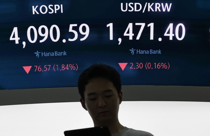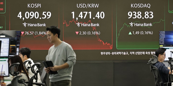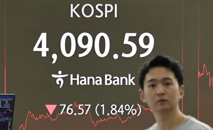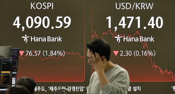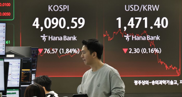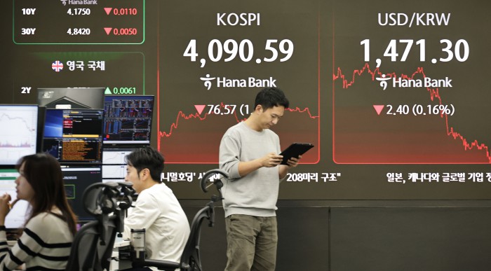 [서울=뉴스핌] 양윤모 기자 = 15일 오후 코스피가 전장 종가보다 76.57 포인트(1.84%) 하락하며 4090.59로, 코스닥은 1.49 포인트(0.16%) 상승한 938.83으로 장을 마감한 가운데, 서울 중구 하나은행 딜링룸에서 직원들이 업무를 보고 있다.