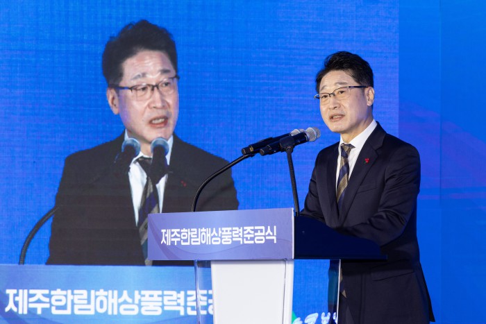 [서울=뉴스핌] 이호현 기후에너지환경부 제2차관이 15일 제주시 한림읍 소재 웨이브 호텔&리조트에서 열린 제주한림해상풍력 준공식에서 축사를 하고 있다. [사진=기후에너지환경부] 2025.12.15 photo@newspim.com