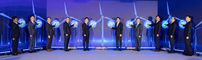 [서울=뉴스핌] 이호현 기후에너지환경부 제2차관이 15일 제주시 한림읍 소재 웨이브 호텔&리조트에서 열린 주한림해상풍력 준공식에서 참석자들과 세리머니를 하고 있다. [사진=기후에너지환경부] 2025.12.15 photo@newspim.com