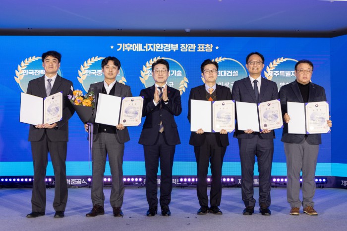 [서울=뉴스핌] 이호현 기후에너지환경부 제2차관이 15일 제주시 한림읍 소재 웨이브 호텔&리조트에서 열린 제주한림해상풍력 준공식에서 준공 유공자에 대한 장관 표창을 수여한 뒤 기념촬영을 하고 있다. [사진=기후에너지환경부] 2025.12.15 photo@newspim.com