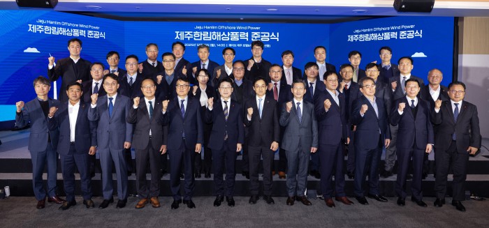 [서울=뉴스핌] 이호현 기후에너지환경부 제2차관이 15일 제주시 한림읍 소재 웨이브 호텔&리조트에서 열린 제주한림해상풍력 준공식에서 참석자들과 기념촬영을 하고 있다. [사진=기후에너지환경부] 2025.12.15 photo@newspim.com