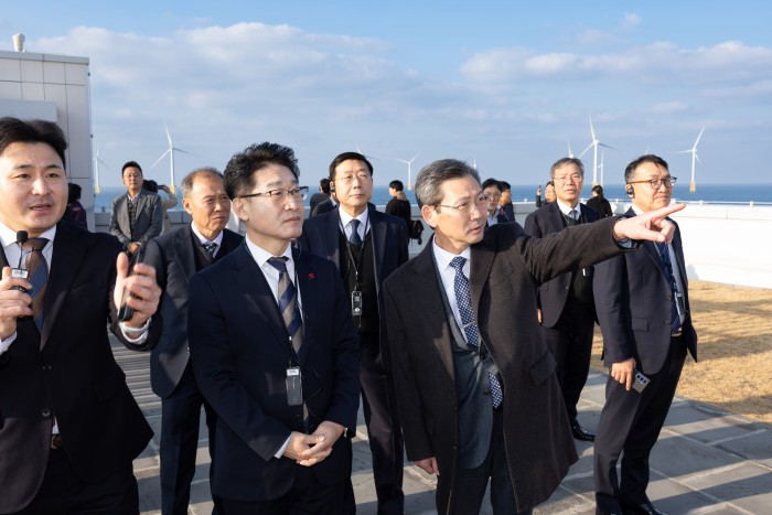 [서울=뉴스핌] 이호현 기후에너지환경부 제2차관이 15일 제주시 한림읍 소재 제주한림해상풍력에서 발전단지에 사용된 부품들을 점검한 뒤 풍력발전기가 설치된 단지 주변을 둘러보고 있다. [사진=기후에너지환경부] 2025.12.15 photo@newspim.com