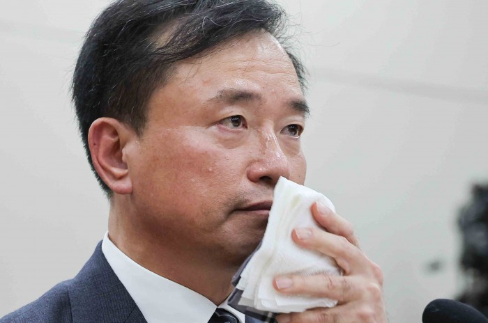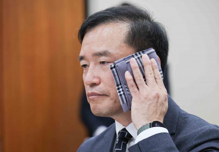 [서울=뉴스핌] 윤창빈 기자 = 김종철 방송미디어통신위원장 후보자가 16일 서울 여의도 국회 과학기술정보방송통신위원회 전체회의에서 열린 인사청문회에서 손수건으로 땀을 닦고 있다. 2025.12.16 pangbin@newspim.com