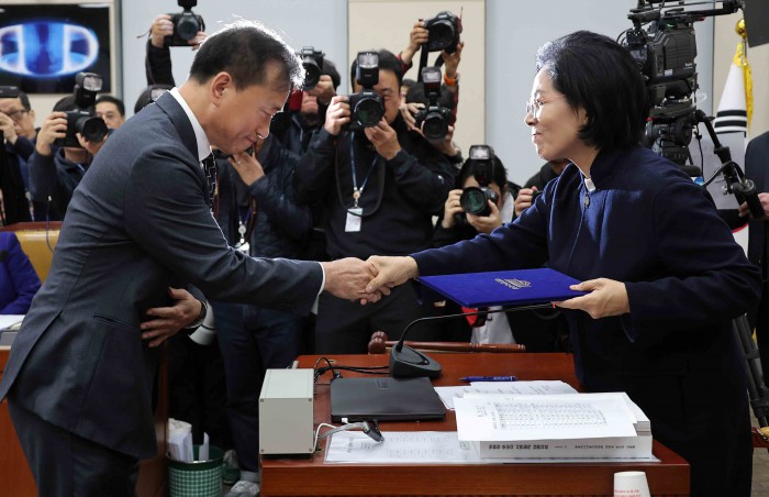 [서울=뉴스핌] 윤창빈 기자 = 김종철 방송미디어통신위원장 후보자가 16일 서울 여의도 국회 과학기술정보방송통신위원회 전체회의에서 열린 인사청문회에서 최민희 위원장에게 선서문 전달을 마치고 악수하고 있다. 2025.12.16 pangbin@newspim.com