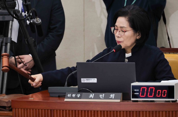 [서울=뉴스핌] 윤창빈 기자 = 최민희 위원장이 16일 서울 여의도 국회에서 열린 과학기술정보방송통신위원회 전체회의에서 의사봉을 두드리고 있다. 2025.12.16 pangbin@newspim.com