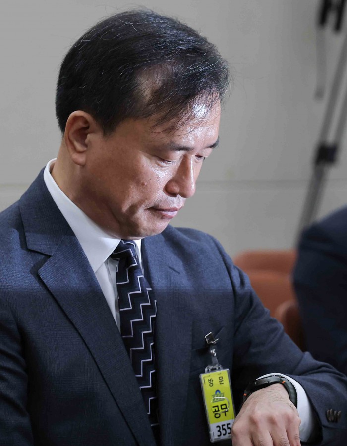 [서울=뉴스핌] 윤창빈 기자 = 김종철 방송미디어통신위원장 후보자가 16일 서울 여의도 국회 과학기술정보방송통신위원회 전체회의에서 열린 인사청문회에서 시간을 확인하고 있다. 2025.12.16 pangbin@newspim.com