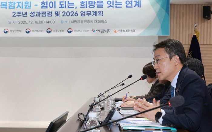 [서울=뉴스핌] 김학선 기자 = 권대영 금융위원회 부위원장이 16일 서울 중구 서민금융진흥원에서 열린 복합지원 2주년 성과 점검 및 2026년 업무계획 발표 행사에서 모두발언을 하고 있다. 2025.12.16 yooksa@newspim.com