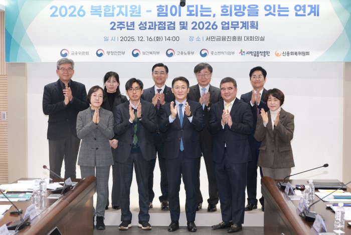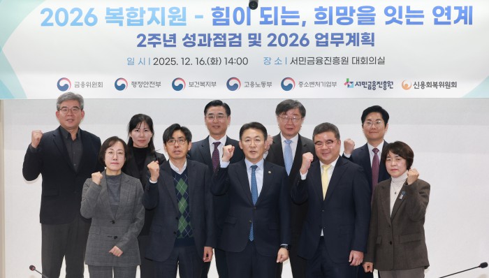 [서울=뉴스핌] 김학선 기자 = 권대영 금융위원회 부위원장과 이재연 서민금융진흥원장을 비롯해 참석자들이 16일 서울 중구 서민금융진흥원에서 열린 복합지원 2주년 성과 점검 및 2026년 업무계획 발표 행사에서 기념촬영을 하고 있다. 2025.12.16 yooksa@newspim.com