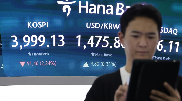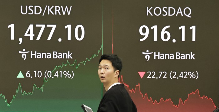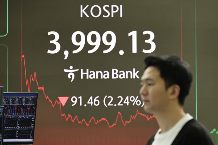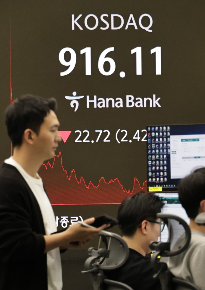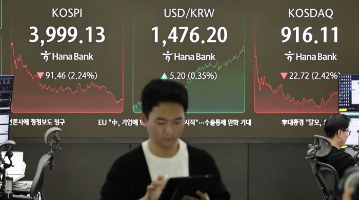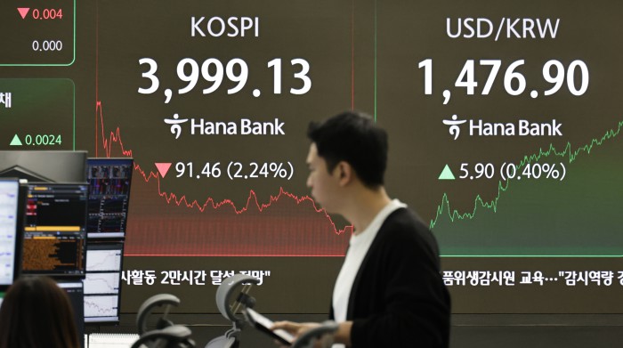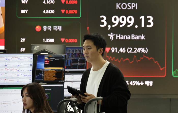 [서울=뉴스핌] 양윤모 기자 = 인공지능(AI) 거품론 및 미국 고용지표 발표에 대한 경계감으로 16일 오후 코스피가 전장 종가보다 91.46 포인트(2.24%) 하락하며 3999.13로, 코스닥은 22.72 포인트(2.42%) 하락한 916.11로 장을 마감한 가운데, 서울 중구 하나은행 딜링룸에서 직원들이 업무를 보고 있다.